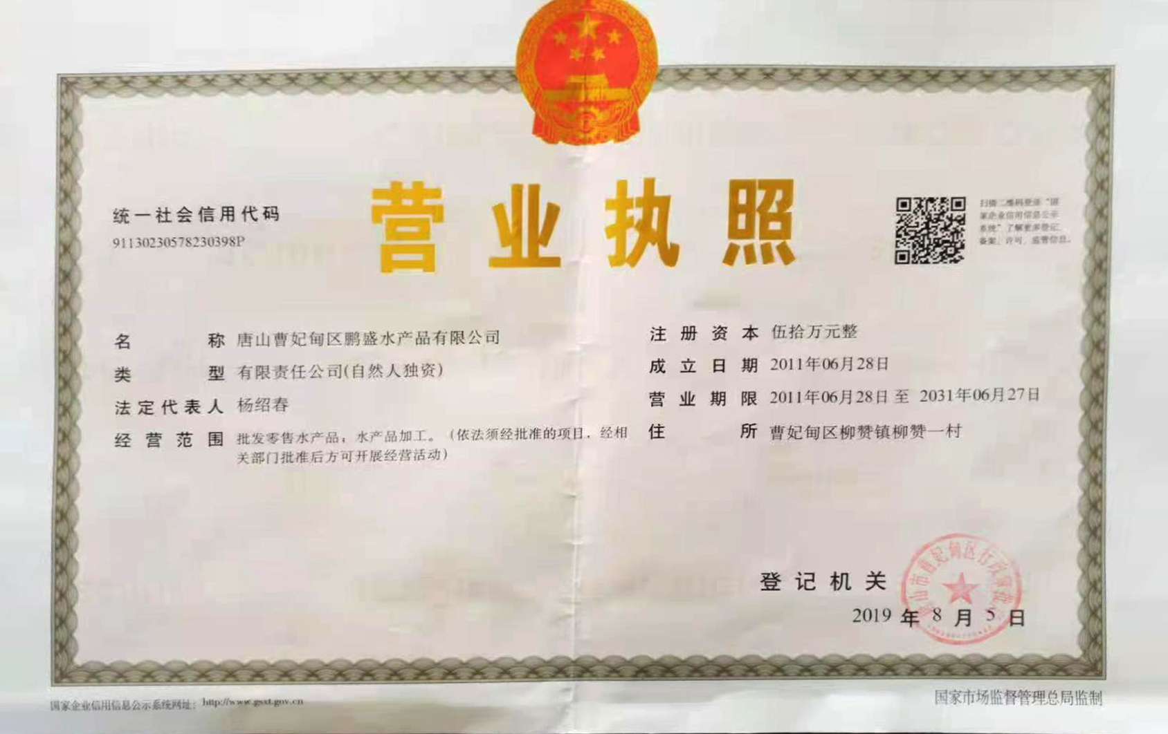 唐山曹妃甸区鹏盛水产品有限公司成立于2011年,主要从事东方虾、海蜇、贝类等海产品的养殖、加工及销售,注重特色旅游的发展,是一家一二三产融合发展型企业。公司拥有海水养殖基地面积1500亩,建有年加工能力1500吨、仓储容量3000立方米的冷库一座。 提升市场竞争力。公司产品常年销往北京、天津、河北、山东、辽宁、浙江、福建等省市。 为满足市场需求,鹏盛水产依托当地的海产品资源开发出了近百种产品,几乎涵盖了所有的当地海产品,并获得了食品生产许可证(SC12213021000540)和ISO9001、HACCP认证,符合各类标准。冻货主要有:东方虾(30多个规格)、盐田南美虾(10多种规格)、八带鱼、皮皮虾肉、墨斗鱼、牡蛎肉、海螺肉、玉螺肉、杂色蛤肉、舌鳎、河豚鱼、海鲈鱼、面条鱼、文蛤、青蛤、海肠子、竹节蛏、黄须菜、扇贝柱、虾仁等。干货主要有:烘干东方虾、烘干南美虾、烘干尤光鱼、烘干八带、白海米。其他产品有:虾油、虾酱、海蜇。